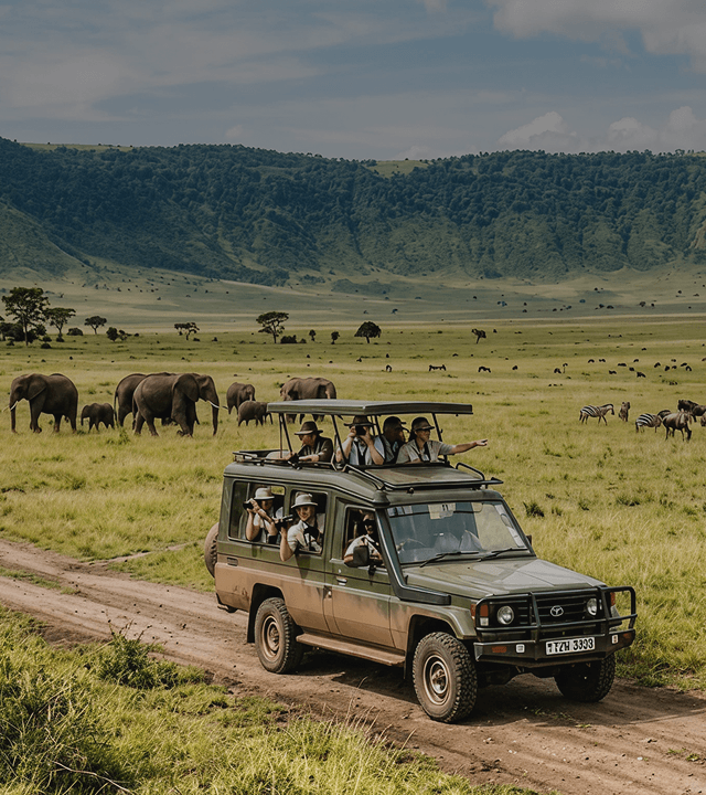Сафари на дне кратера — Обед-пикник среди дикой природы — Встреча с «Большой пятеркой» — Вечерний отдых в лодже